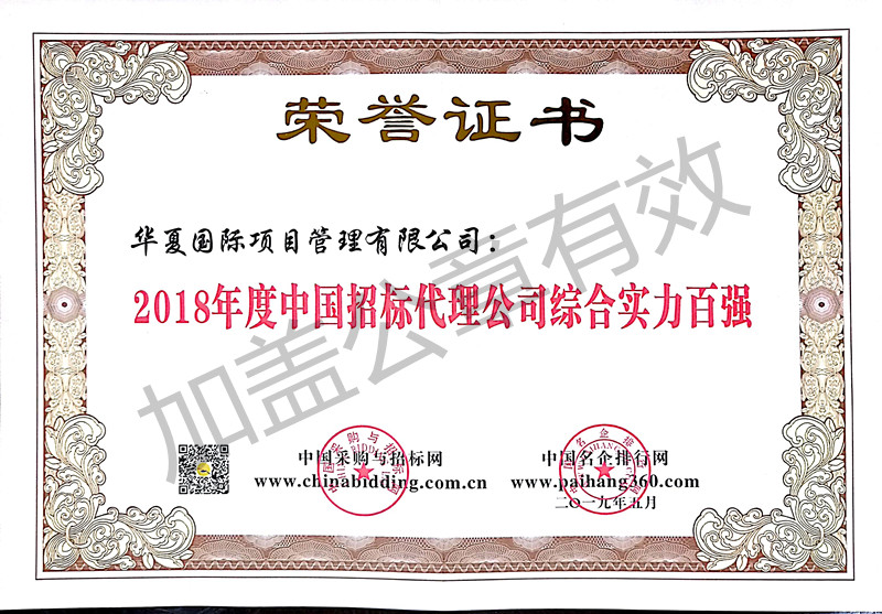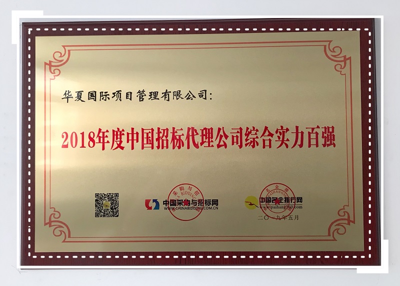 2019年5月,華夏國際項(xiàng)目管理有限公司在全國招投標(biāo)領(lǐng)域年度聚焦評價推介活動中榮獲“2018年度中國招標(biāo)代理公司綜合實(shí)力百強(qiáng)”。全國招投標(biāo)領(lǐng)域年度聚焦評價推介活動由中國采購與招標(biāo)網(wǎng)、中國名企排行網(wǎng)于2007年發(fā)起,至今已連續(xù)舉辦13屆,已成為全國招投標(biāo)領(lǐng)域的典范與風(fēng)向標(biāo)。