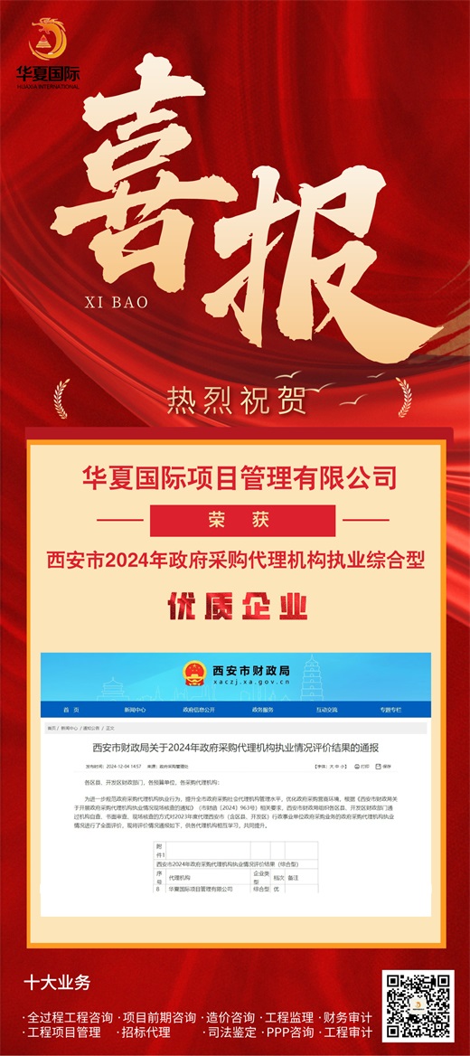 華夏國(guó)際項(xiàng)目管理有限公司獲評(píng)西安市2024年政府采購(gòu)代理機(jī)構(gòu)執(zhí)業(yè)綜合型優(yōu)質(zhì)企業(yè)